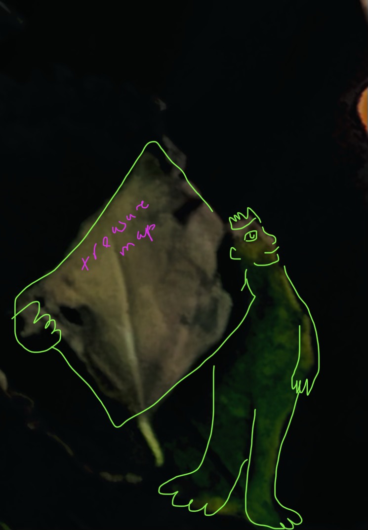 This is extra silly but to me it look like an Ancient Extraterrestrial Adventurer Explorer holding an Extraterrestrial Treasure Map !, he finds Extraterrestrial Treasure Chest of Extraterrestrial Outer Space Gems !, Extraterrestrial Fruits Gems !, of Extraterrestrials Flavors ! By Windy Rainy Stormy Castle!